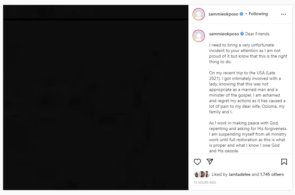 On my recent trip to the USA (Late 2021), I got intimately involved with a lady, knowing that this was not appropriate as a married man and a minister of the gospel. I am ashamed and regret my actions as it has caused a lot of pain to my dear wife, Ozioma, my family and I.